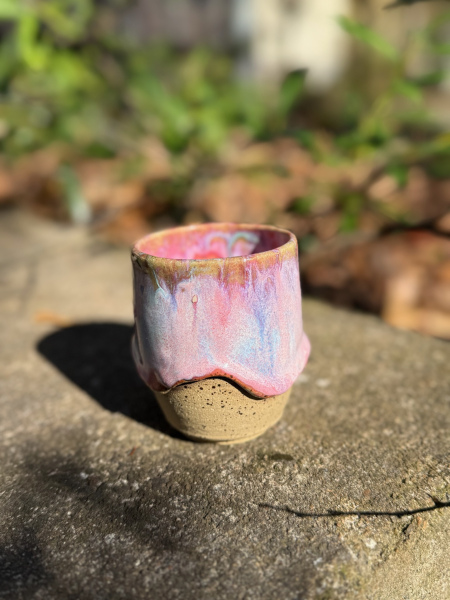 Handcrafted in stoneware, it features a softly faceted form that feels organic and grounding in the hand. The glaze is the star: a luminous blend of blush pink, lavender, and hints of sky blue, flowing and breaking naturally over the surface like a watercolor caught mid-motion. Where the glaze thins near the base, it reveals a warm, speckled clay body, creating a beautiful contrast that highlights the piece’s handmade nature.