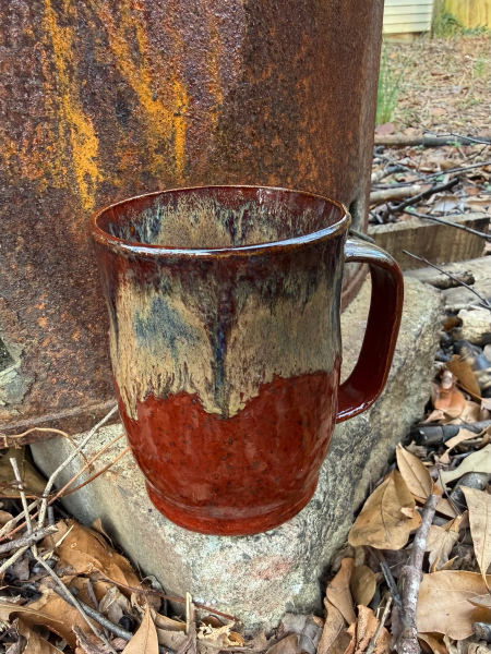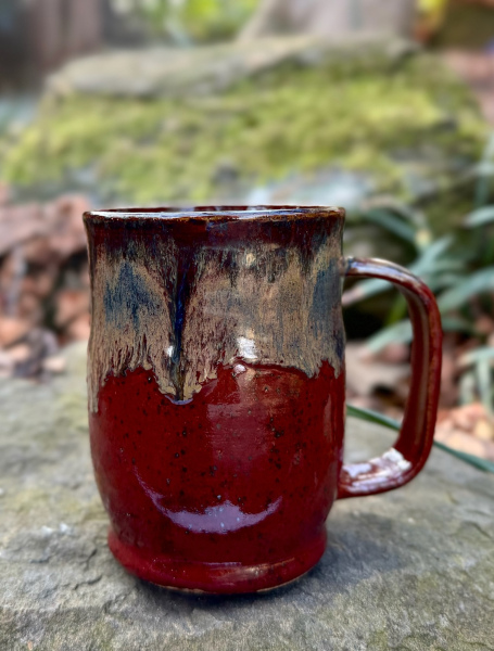 Hand-thrown in stoneware, it features a strong, grounded form with a comfortably sized handle that feels secure and natural in the hand. The glaze work is the true showpiece: a deep, glossy red base layered with speckling that adds texture and visual warmth. From the rim, a cascade of smoky charcoal, steel blue, and ash-toned glaze flows downward, creating a striking contrast that feels raw and elemental—like molten glaze frozen in motion.