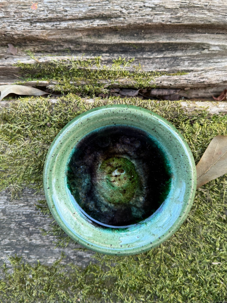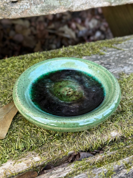 This handcrafted ceramic and glass plate is a true statement of organic beauty. Glazed in rich, mossy greens and deep purples, it features a mesmerizing, glass-like center that draws the eye inward—almost like a still forest pool or a polished stone found along a stream. The subtle speckling and natural color variations give it a one-of-a-kind character, ensuring no two pieces are exactly alike.