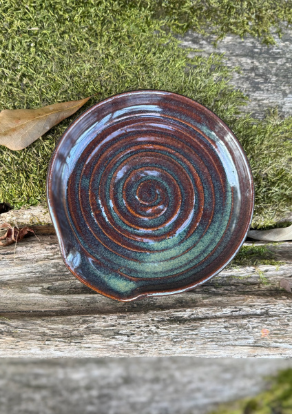Glazed in deep rust browns, ocean greens, and subtle hints of blue, the surface forms a striking spiral pattern that draws the eye toward the center—each ring a reminder of the potter’s wheel and the care taken in its creation. The glossy finish enhances the depth of color, giving the piece a softly luminous quality that shifts beautifully in the light.