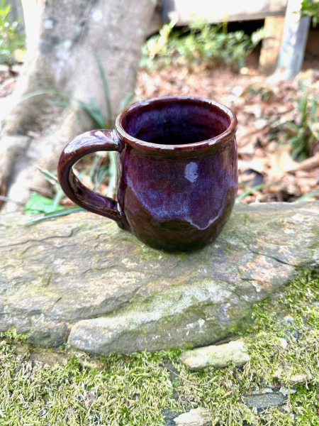 This hand-thrown stoneware mug is designed for slow mornings and quiet moments. Its rounded form fits comfortably in the hand, while the gently pulled handle offers a secure, balanced grip. The deep plum glaze shifts subtly between wine, berry, and earthy brown tones, catching the light differently from every angle and highlighting the mug’s handmade character.