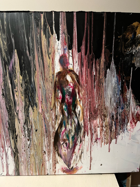 The vertical drips immediately set the tone. They read as gravity, time, and inevitability all at once—paint literally pulling itself downward. That motion creates a sense of collapse or surrender, which contrasts powerfully with the central figure still standing, still present, even as the world around (and within) them seems to melt.