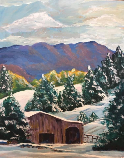 The cool blues and whites of the snow contrast nicely with the warmer browns of the barn and the hints of gold and green in the midground. That touch of warmth keeps the scene from feeling cold or stark—it feels lived-in, calm, and safe. The mountains, with their muted purples and blues, sit back exactly where they should, creating distance without overpowering the foreground.